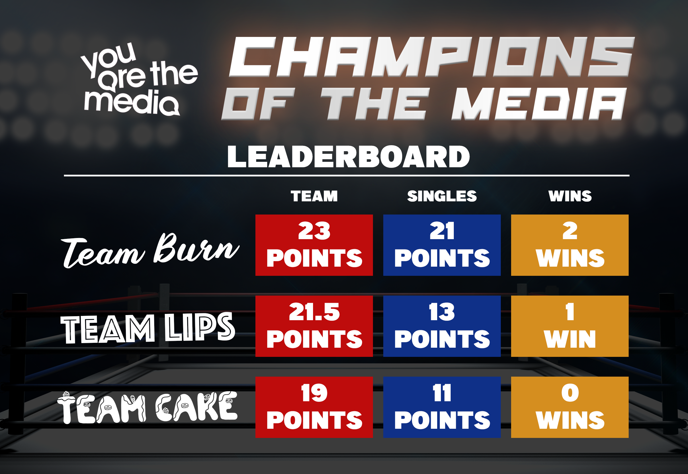 Our first team tournament became a fatal three-way as Teams Burn and Lips faced a late addition to the match, Team Cake, led by Jake ‘The Cake’ Moore and featuring Caitlyn ‘The Smiling Assassin’ Walters who brought 11 points with her from her singles match in March.