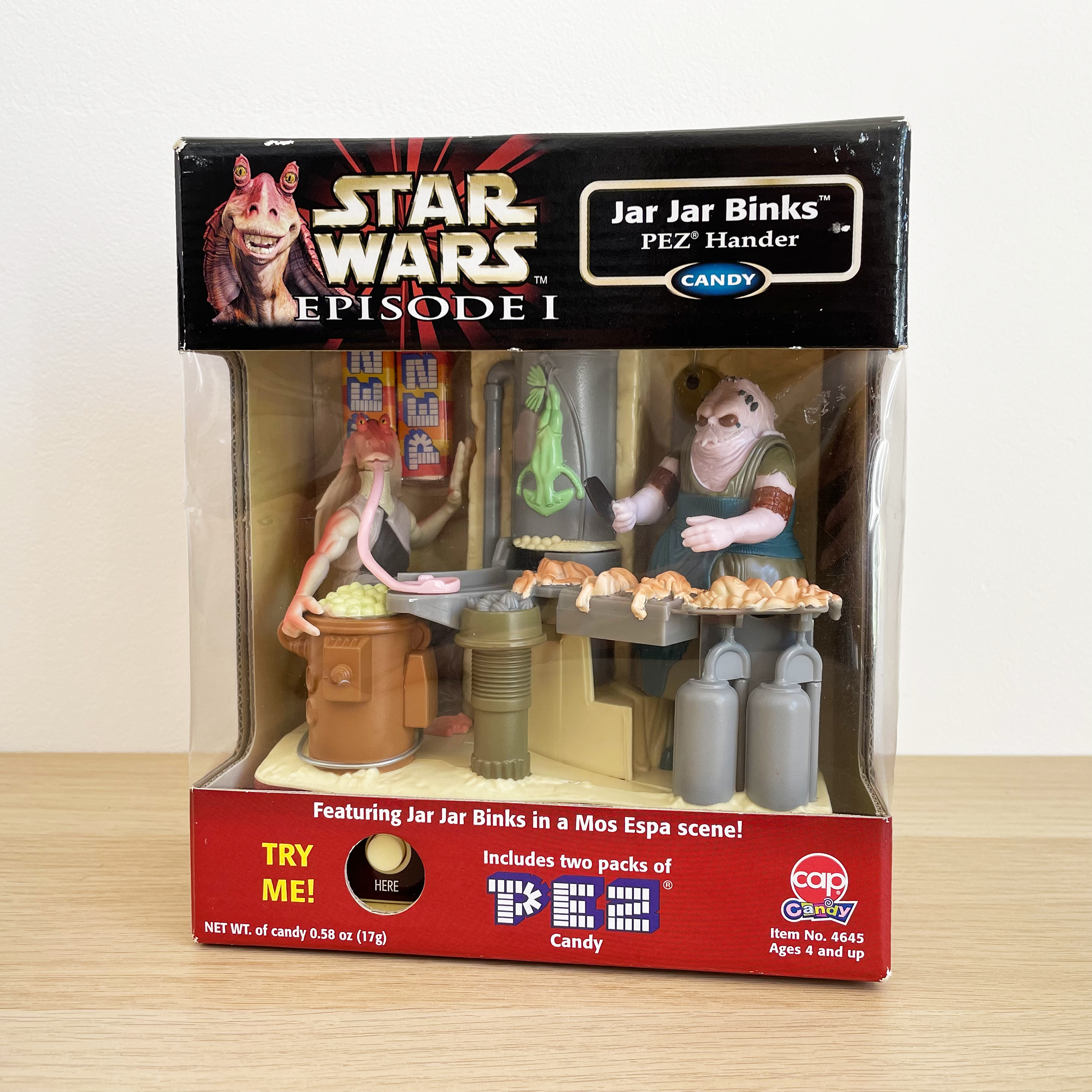 Of all the Jar Jar related products that formed the Episode I collection, the line was drawn at a standalone Pez dispenser. Instead, they actually went a step further and produced an elaborate scene, which, like the Watto’s box, is brief in its screen time, that dispenses Pez in a far less conventional way.