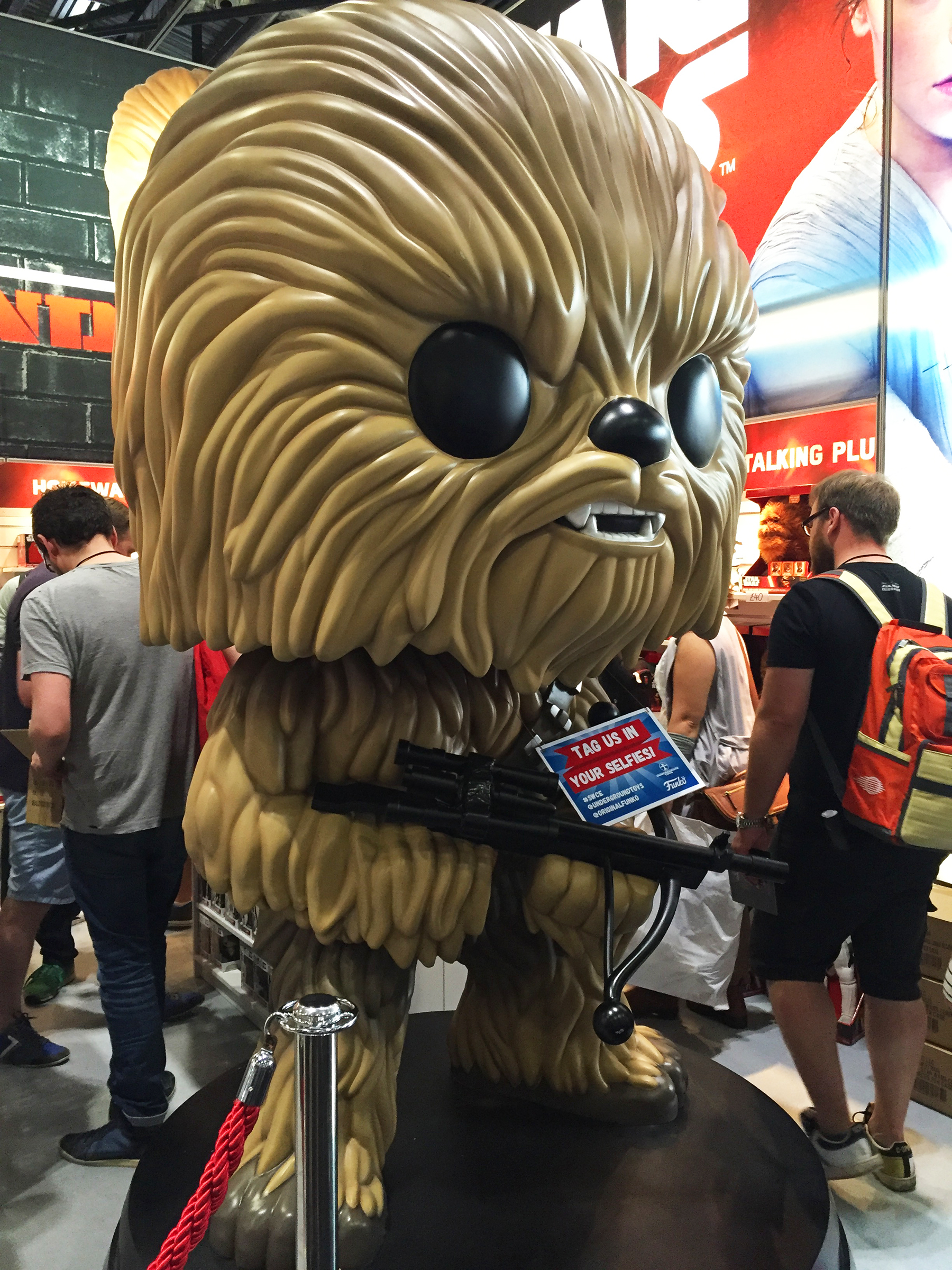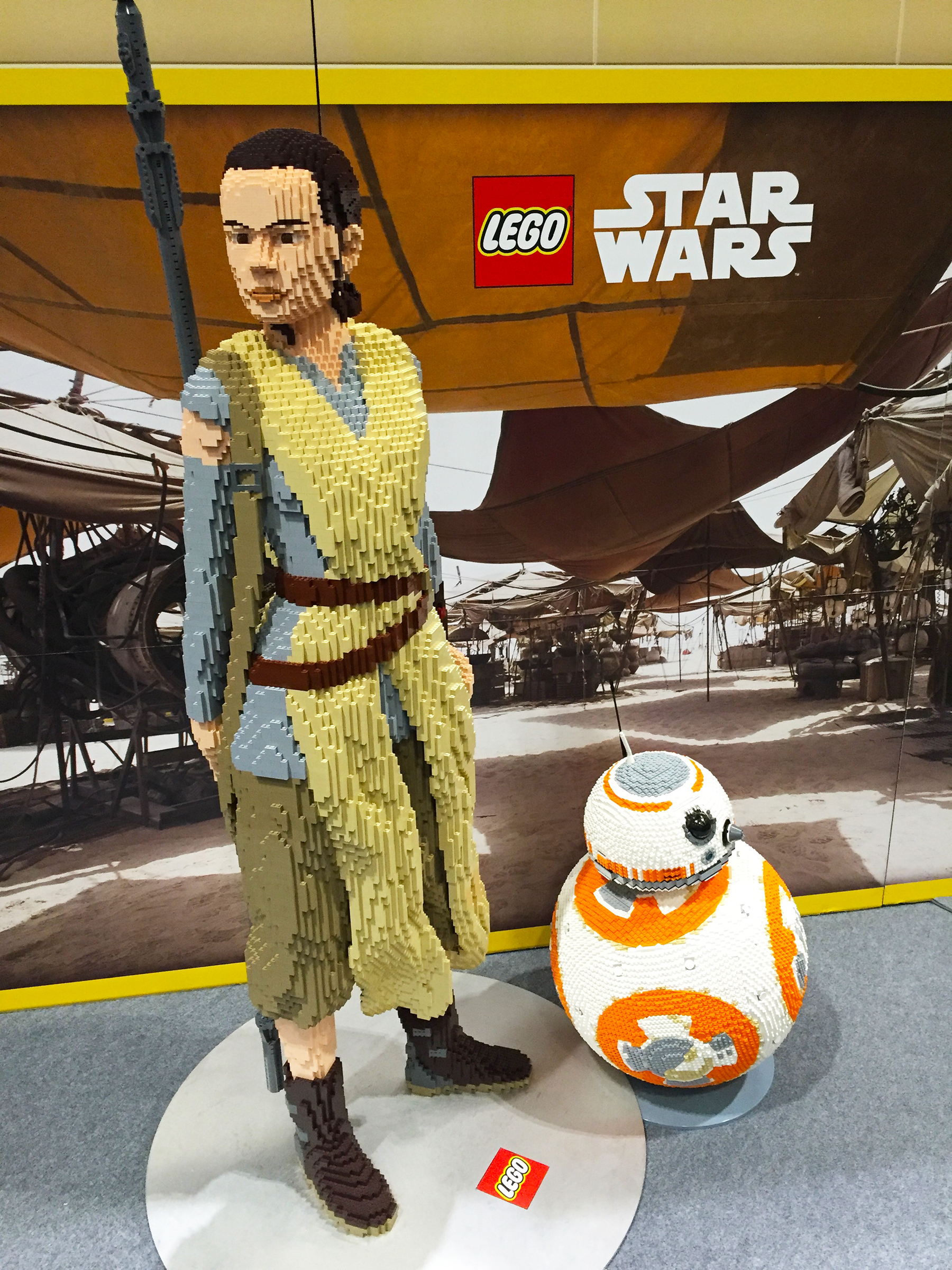 Giant Chewbacca Funko Pop (left, ofc), life sized Lego Rey and BB-8