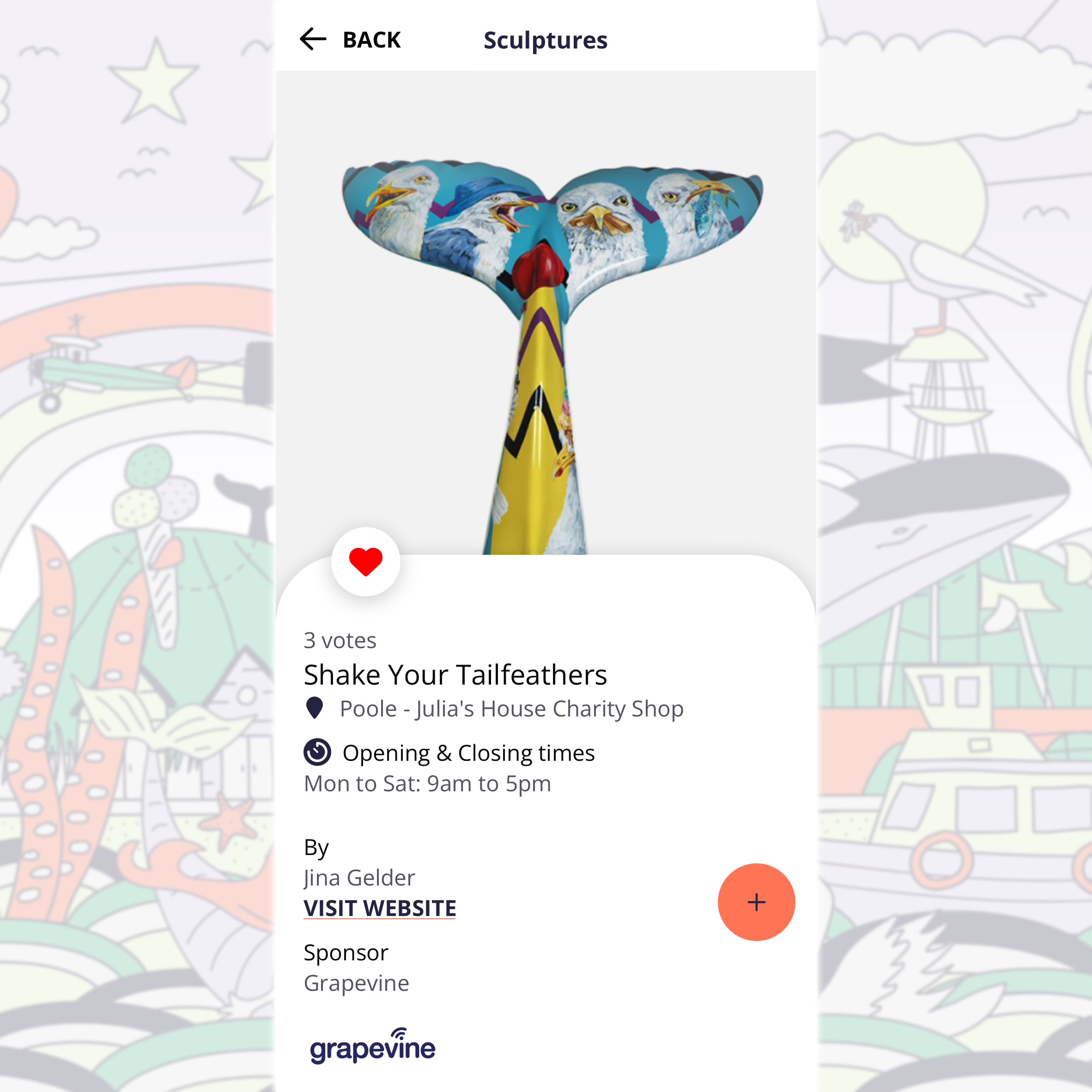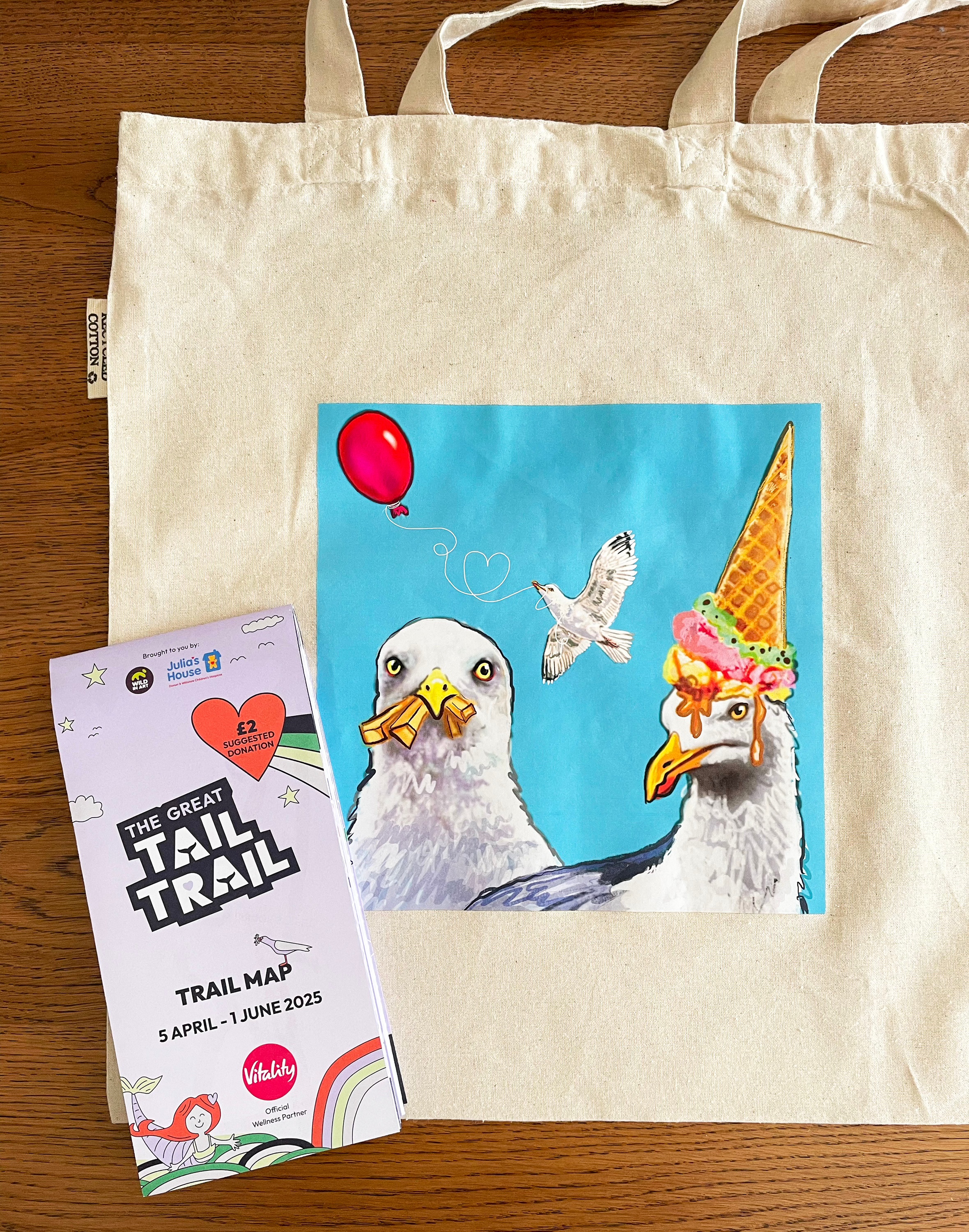 The tail we sponsored, ‘Shake Your Tailfeathers’, was painted by the talented Jina Gelder. The iconic seagulls it features were selected as one of four designs for a series of inspired-by merchandise which proved popular in the Julia’s House retail shops.